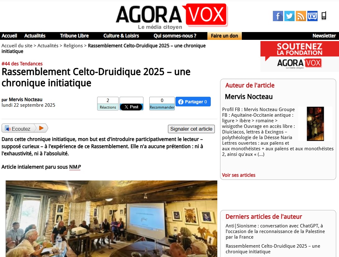 Un grand merci à Mervis Nocteau pour son article publié sur Agora Vox au sujet du rassemblement des assemblées celto-druidiques qui s'est tenu à Tréhorenteuc en août 2025.