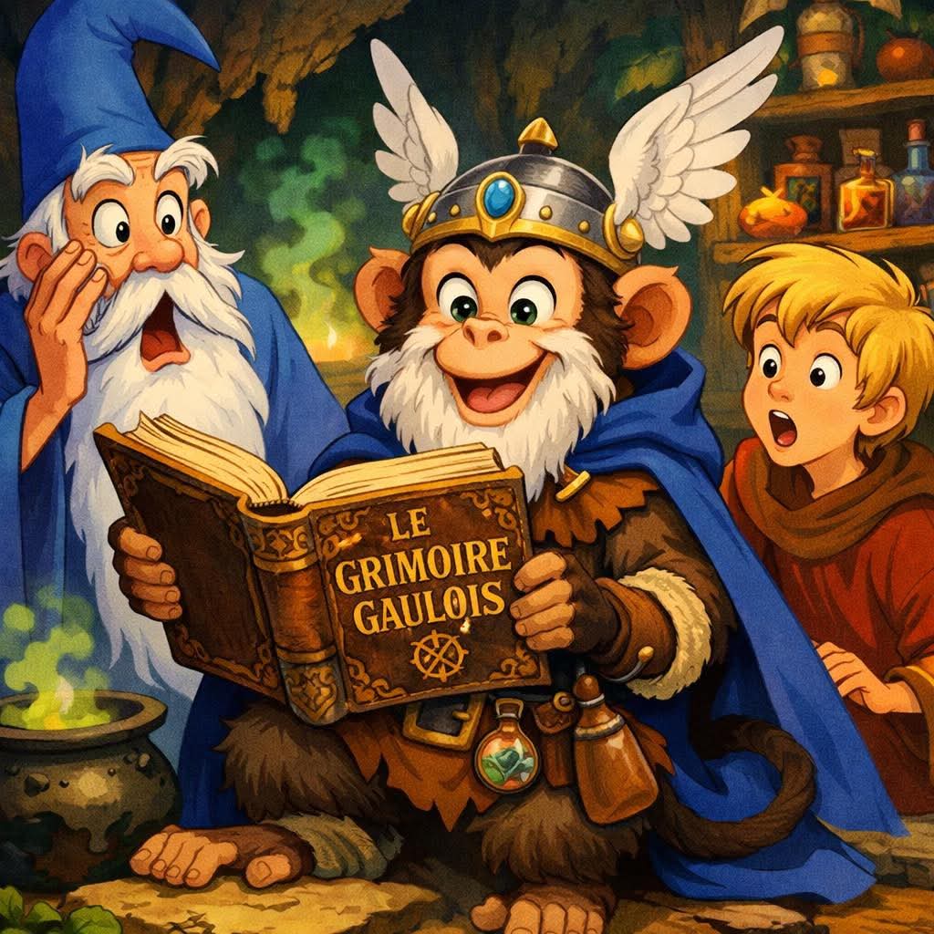 Mais… Merlin… pourquoi ce singe essaie de te copier ? Il a la robe, le chapeau, même ton vieux grimoire… enfin, une version mâchouillée…