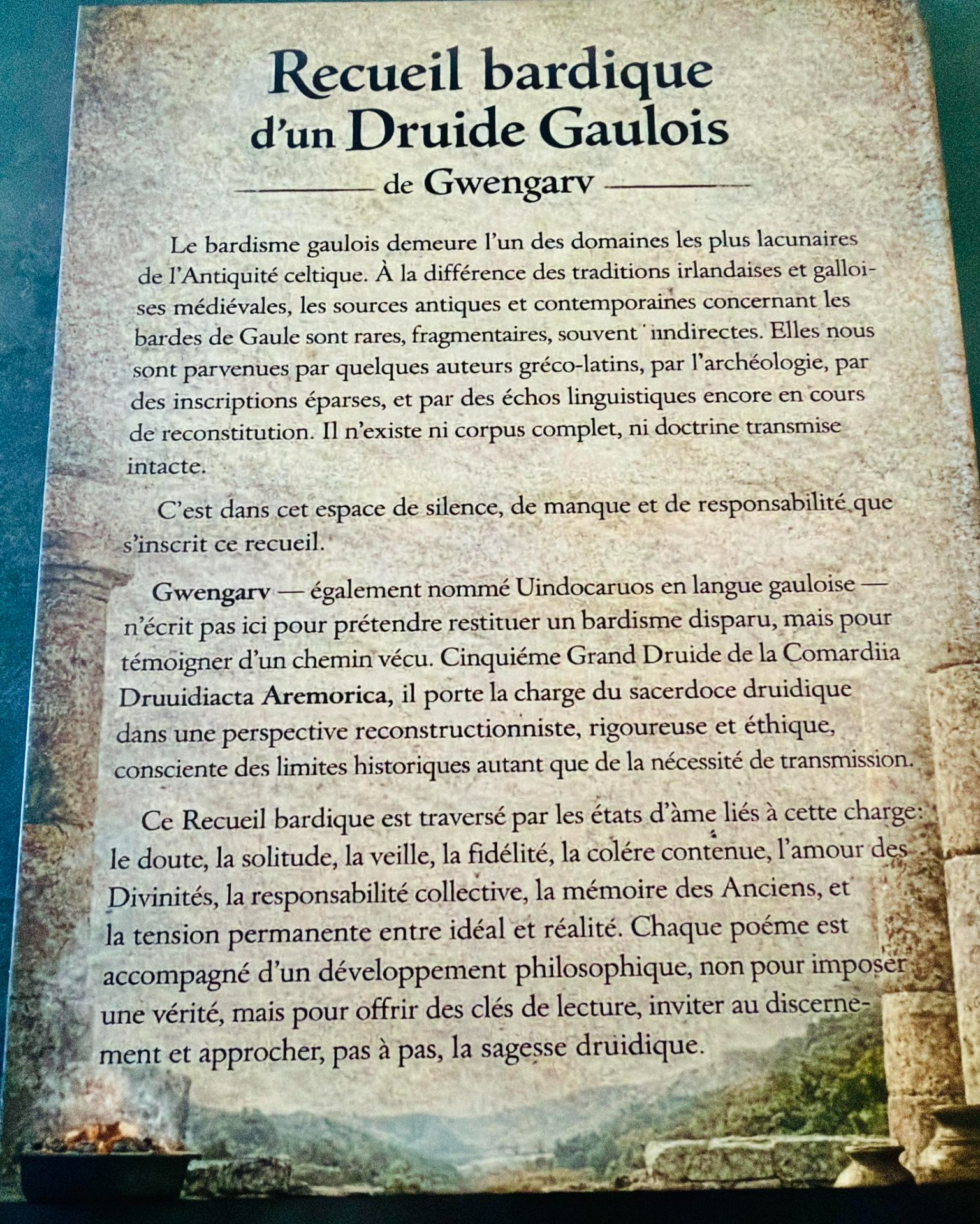 Ce livre s'inscrit dans une démarche de transmission, nourrie par l'étude, l'expérience, la poésie et le respect de l'héritage celtique. Dans un domaine encore fragmentaire, il ne prétend pas reconstituer un passé perdu, mais proposer une parole sincère, enracinée et réfléchie.